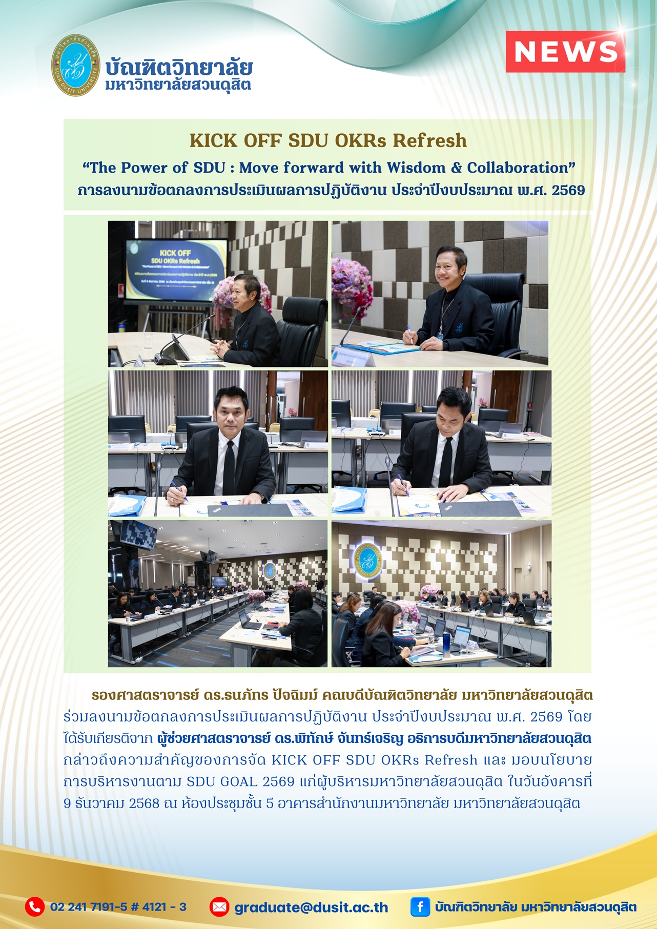 รองศาสตราจารย์ ดร.ธนภัทร ปัจฉิมม์ คณบดีบัณฑิตวิทยาลัย มหาวิทยาลัยสวนดุสิต ร่วมลงนามข้อตกลงการประเมินผลการปฏิบัติงาน ประจำปีงบประมาณ พ.ศ. 2569 โดยได้รับเกียรติจาก ผู้ช่วยศาสตราจารย์ ดร.พิทักษ์ จันทร์เจริญ อธิการบดีมหาวิทยาลัยสวนดุสิต กล่าวถึงความสำคัญของการจัด KICK OFF SDU OKRs Refresh และ มอบนโยบายการบริหารงานตาม SDU GOAL 2569 แก่ผู้บริหารมหาวิทยาลัยสวนดุสิต ในวันอังคารที่ 9 ธันวาคม 2568 ณ ห้องประชุมชั้น 5 อาคารสำนักงานมหาวิทยาลัย มหาวิทยาลัยสวนดุสิต