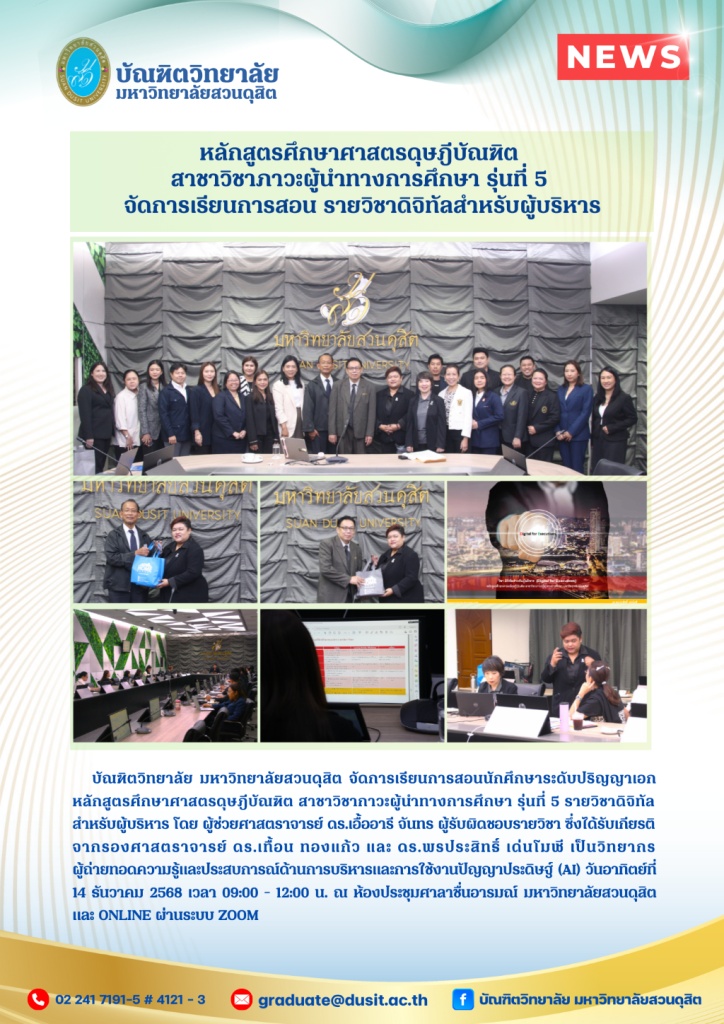 บัณฑิตวิทยาลัย มหาวิทยาลัยสวนดุสิต จัดการเรียนการสอนนักศึกษาระดับปริญญาเอก หลักสูตรศึกษาศาสตรดุษฎีบัณฑิต สาชาวิชากาวะผู้นำทางการศึกษา รุ่นที่ 5 รายวิชาดิจิทัลสำหรับผู้บริหาร โดย ผู้ช่วยศาสตราจารย์ ดร.เอื้ออารี จันทร ผู้รับผิดชอบรายวิชา ซึ่งได้รับเกียรติจากรองศาสตราจารย์ ดร.เทื้อน ทองแก้ว และ ดร.พรประสิทธิ์ เด่นโมฬี เป็นวิทยากรผู้ถ่ายทอดความรู้และประสบการณ์ด้านการบริหารและการใช้งานปัญญาประดิษฐ์ (AI) วันอาทิตย์ที่ 14 ธันวาคม 2568 เวลา 09:00 – 12:00 น. ณ ห้องประชุมศาลาชื่นอารมณ์ มหาวิทยาลัยสวนดุสิต และ ONLINE ผ่านระบบ ZOOM