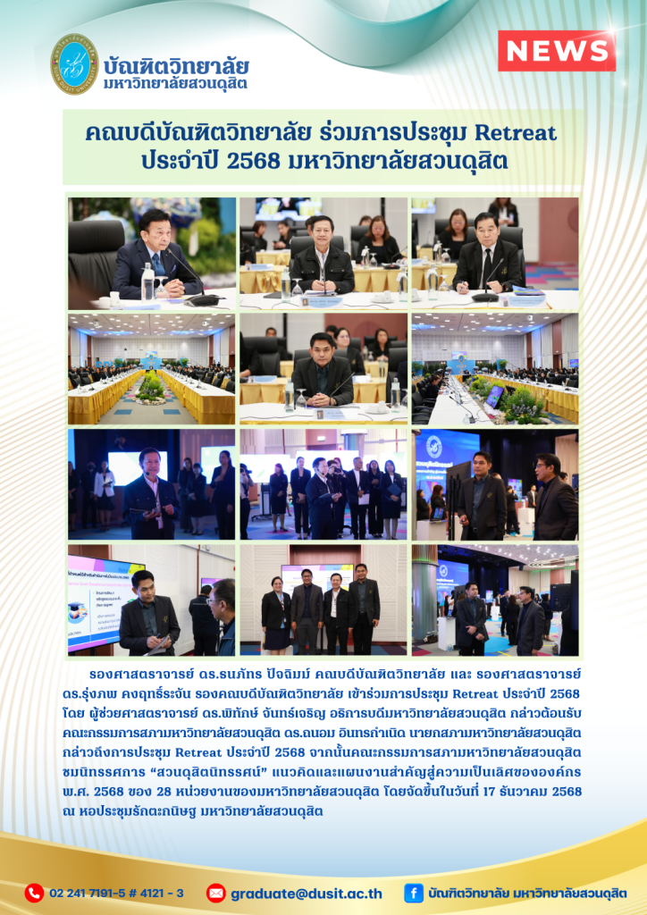 รองศาสตราจารย์ ดร.ธนภัทร ปัจฉิมม์ คณบดีบัณฑิตวิทยาลัย และ รองศาสตราจารย์ ดร.รุ่งภพ คงฤทธิ์ระจัน รองคณบดีบัณฑิตวิทยาลัย เข้าร่วมการประชุม Retreat ประจำปี 2568 โดย ผู้ช่วยศาสตราจารย์ ดร.พิทักษ์ จันทร์เจริญ อธิการบดีมหาวิทยาลัยสวนดุสิต กล่าวต้อนรับคณะกรรมการสภามหาวิทยาลัยสวนดุสิต ดร.ถนอม อินทรกำเนิด นายกสภามหาวิทยาลัยสวนดุสิต กล่าวถึงการประชุม Retreat ประจำปี 2568 จากนั้นคณะกรรมการสภามหาวิทยาลัยสวนดุสิต ชมนิทรรศการ “สวนดุสิตนิทรรศน์” แนวคิดและแผนงานสำคัญสู่ความเป็นเลิศขององค์กร พ.ศ. 2568 ของ 28 หน่วยงานของมหาวิทยาลัยสวนดุสิต โดยจัดขึ้นในวันที่ 17 ธันวาคม 2568 ณ หอประชุมรักตะกนิษฐ มหาวิทยาลัยสวนดุสิต