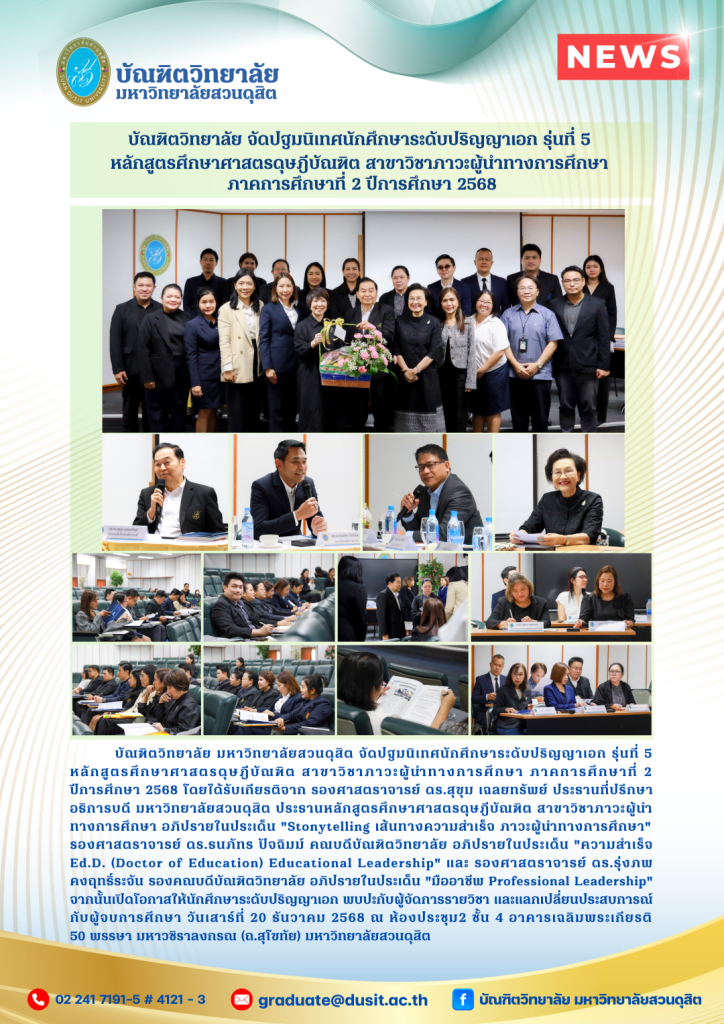 บัณฑิตวิทยาลัย มหาวิทยาลัยสวนดุสิต จัดปฐมนิเทศนักศึกษาระดับปริญญาเอก รุ่นที่ 5 หลักสูตรศึกษาศาสตรดุษฎีบัณฑิต สาขาวิชาภาวะผู้นำทางการศึกษา ภาคการศึกษาที่ 2 ปีการศึกษา 2568 โดยได้รับเกียรติจาก รองศาสตราจารย์ ดร.สุขุม เฉลยทรัพย์ ประธานที่ปรึกษาอธิการบดี มหาวิทยาลัยสวนดุสิต ประธานหลักสูตรศึกษาศาสตรดุษฎีบัณฑิต สาขาวิชาภาวะผู้นำทางการศึกษา อภิปรายในประเด็น “Stonytelling เส้นทางความสำเร็จ ภาวะผู้นำทางการศึกษา” รองศาสตราจารย์ ดร.ธนภัทร ปัจฉิมม์ คณบดีบัณฑิตวิทยาลัย อภิปรายในประเด็น “ความสำเร็จ Ed.D. (Doctor of Education) Educational Leadership” และ รองศาสตราจารย์ ดร.รุ่งภพ คงฤทธิ์ระจัน รองคณบดีบัณฑิตวิทยาลัย อภิปรายในประเด็น “มืออาชีพ Professional Leadership” จากนั้นเปิดโอกาสให้นักศึกษาระดับปริญญาเอก พบปะกับผู้จัดการรายวิชา และแลกเปลี่ยนประสบการณ์กับผู้จบการศึกษา วันเสาร์ที่ 20 ธันวาคม 2568 ณ ห้องประชุม2 ชั้น 4 อาคารเฉลิมพระเกียรติ 50 พรรษา มหาวชิราลงกรณ (ถ.สุโขทัย) มหาวิทยาลัยสวนดุสิต