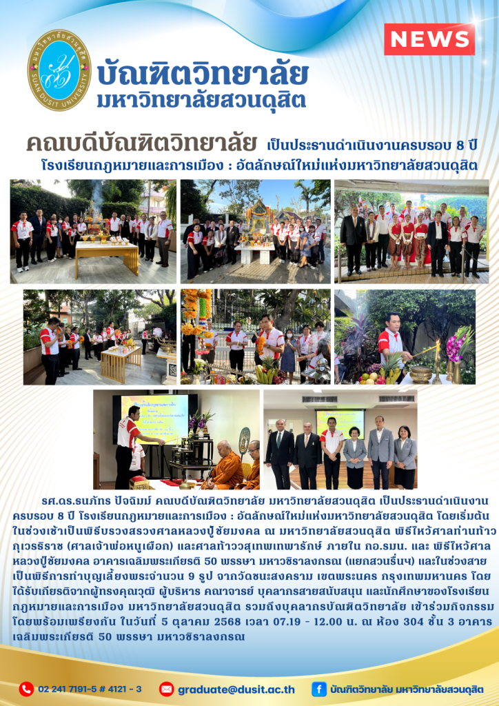 รศ.ดร.ธนภัทร ปัจฉิมม์ คณบดีบัณฑิตวิทยาลัย มหาวิทยาลัยสวนดุสิต เป็นประธานดำเนินงาน ครบรอบ 8 ปี โรงเรียนกฎหมายและการเมือง : อัตลักษณ์ใหม่แห่งมหาวิทยาลัยสวนดุสิต โดยเริ่มต้นในช่วงเช้าเป็นพิธีบรวงสรวงศาลหลวงปู่ชัยมงคล ณ มหาวิทยาลัยสวนดุสิต พิธีไหว้ศาลท่านท้าวกุเวรธิราช (ศาลเจ้าพ่อหนูเผือก) และศาลท้าววสุเทพเทพารักษ์ ภายใน กอ.รมน. และ พิธีไหว้ศาลหลวงปู่ชัยมงคล อาคารเฉลิมพระเกียรติ 50 พรรษา มหาวชิราลงกรณ (แยกสวนรื่นฯ) และในช่วงสายเป็นพิธีการทำบุญเลี้ยงพระจำนวน 9 รูป จากวัดชนะสงคราม เขตพระนคร กรุงเทพมหานคร โดยได้รับเกียรติจากผู้ทรงคุณวุฒิ ผู้บริหาร คณาจารย์ บุคลากรสายสนับสนุน และนักศึกษาของโรงเรียนกฎหมายและการเมือง มหาวิทยาลัยสวนดุสิต รวมถึงบุคลากรบัณฑิตวิทยาลัย เข้าร่วมกิจกรรมโดยพร้อมเพรียงกัน ในวันที่ 5 ตุลาคม 2568 เวลา 07.19 – 12.00 น. ณ ห้อง 304 ชั้น 3 อาคารเฉลิมพระเกียรติ 50 พรรษา มหาวชิราลงกรณ