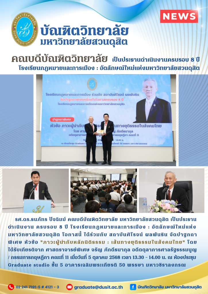 รศ.ดร.ธนภัทร ปัจฉิมม์ คณบดีบัณฑิตวิทยาลัย มหาวิทยาลัยสวนดุสิต เป็นประธานดำเนินงาน ครบรอบ 8 ปี โรงเรียนกฎหมายและการเมือง : อัตลักษณ์ใหม่แห่งมหาวิทยาลัยสวนดุสิต โอกาสนี้ ได้ร่วมกับ สถาบันศิโรจน์ผลพันธิน จัดปาฐกถาพิเศษ หัวข้อ “ภาวะผู้นำกับหลักนิติธรรม : เส้นทางยุติธรรมในสังคมไทย” โดยได้รับเกียรติจาก ศาสตราจารย์พิเศษ จรัญ ภักดีธนากุล อดีตตุลาการศาลรัฐธรรมนูญ / กรรมการกฤษฎีกา คณะที่ 11 เมื่อวันที่ 5 ตุลาคม 2568 เวลา 13.30 – 14.00 น. ณ ห้องประชุมGraduate studio ชั้น 5 อาคารเฉลิมพระเกียรติ 50 พรรษา มหาวชิราลงกรณ
