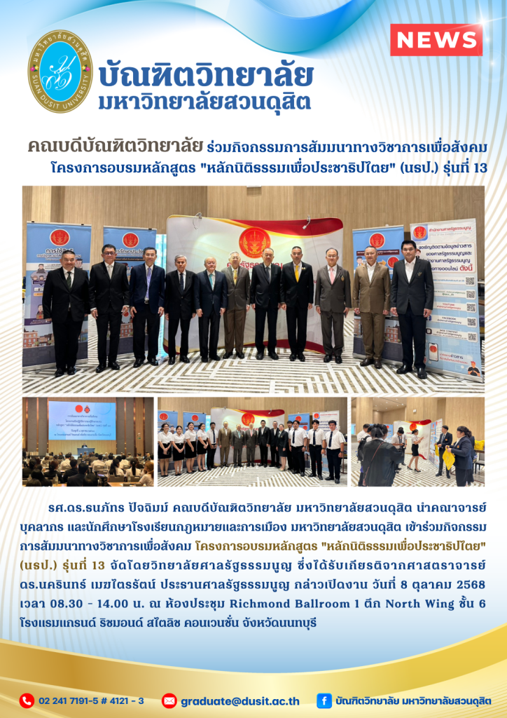 รศ.ดร.ธนภัทร ปัจฉิมม์ คณบดีบัณฑิตวิทยาลัย มหาวิทยาลัยสวนดุสิต นำคณาจารย์ บุคลากร และนักศึกษาโรงเรียนกฎหมายและการเมือง มหาวิทยาลัยสวนดุสิต เข้าร่วมกิจกรรมการสัมมนาทางวิชาการเพื่อสังคม โครงการอบรมหลักสูตร “หลักนิติธรรมเพื่อประชาธิปไตย” (นธป.) รุ่นที่ 13 จัดโดยวิทยาลัยศาลรัฐธรรมนูญ ซึ่งได้รับเกียรติจากศาสตราจารย์ ดร.นครินทร์ เมฆไตรรัตน์ ประธานศาลรัฐธรรมนูญ กล่าวเปิดงาน วันที่ 8 ตุลาคม 2568 เวลา 08.30 – 14.00 น. ณ ห้องประชุม Richmond Ballroom 1 ตึก North Wing ชั้น 6 โรงแรมแกรนด์ ริชมอนด์ สไตลิช คอนเวนชั่น จังหวัดนนทบุรี