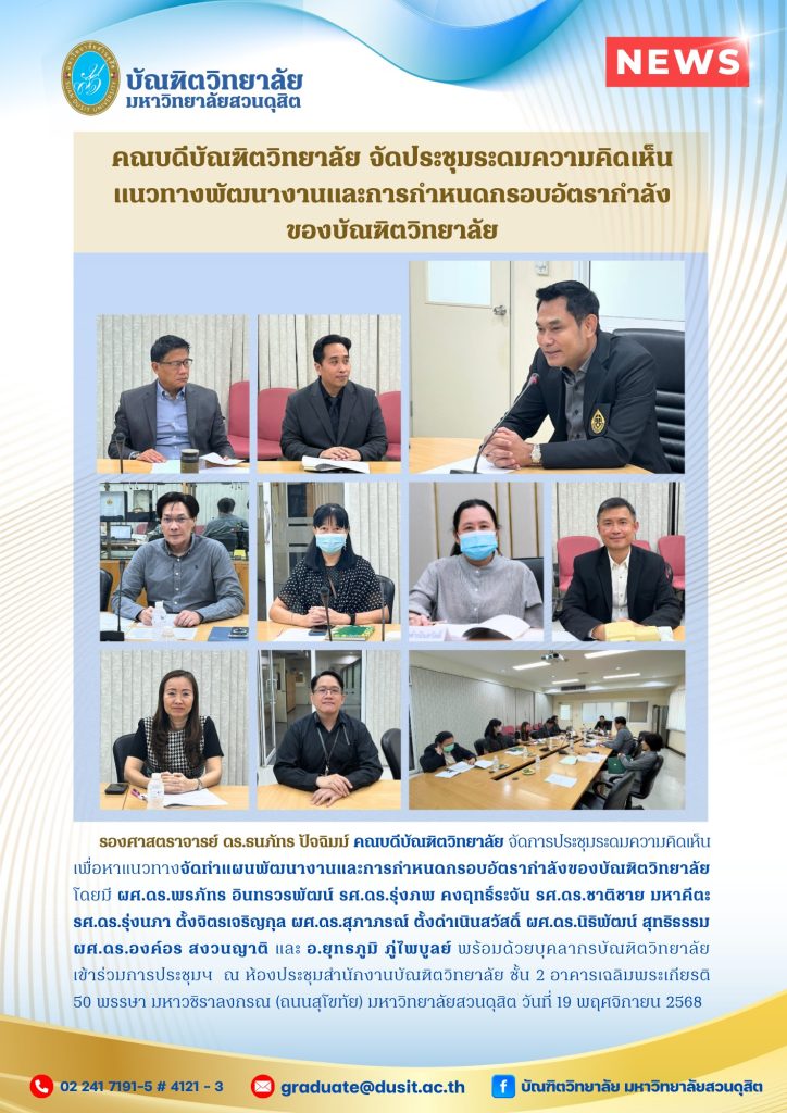 รองศาสตราจารย์ ดร.ธนภัทร ปัจฉิมม์ คณบดีบัณฑิตวิทยาลัย จัดการประชุมระดมความคิดเห็นเพื่อหาแนวทางจัดทำแผนพัฒนางานและการกำหนดกรอบอัตรากำลังของบัณฑิตวิทยาลัย โดยมี ผศ.ดร.พรภัทร อินทรวรพัฒน์ รศ.ดร.รุ่งภพ คงฤทธิ์ระจัน รศ.ดร.ชาติชาย มหาคีตะ โดยมี ผศ.ดร.พรภัทร อินทรวรพัฒน์ รศ.ดร.รุ่งภพ คงฤทธิ์ระจัน รศ.ดร.ชาติชาย มหาคีตะ รศ.ดร.รุ่งนภา ตั้งจิตรเจริญกุล ผศ.ดร.สุภาภรณ์ ตั้งดำเนินสวัสดิ์ ผศ.ดร.นิธิพัฒน์ สุทธิธรรม ผศ.ดร.องค์อร สงวนญาติ และ อ.ยุทธภูมิ ภู่ไพบูลย์ พร้อมด้วยบุคลากรบัณฑิตวิทยาลัย เข้าร่วมการประชุมฯ ณ ห้องประชุมสำนักงานบัณฑิตวิทยาลัย ชั้น 2 อาคารเฉลิมพระเกียรติ 50 พรรษา มหาวชิราลงกรณ (ถนนสุโขทัย) มหาวิทยาลัยสวนดุสิต วันที่ 19 พฤศจิกายน 2568