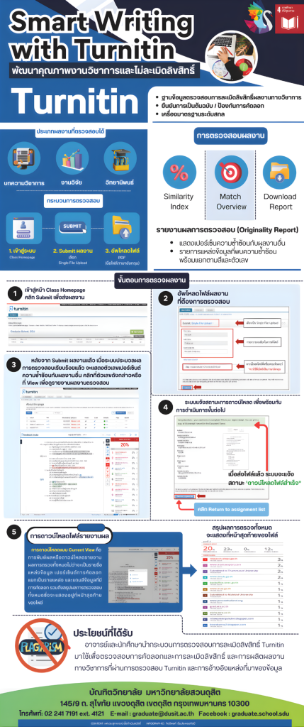 โปรแกรมตรวจสอบการคัดลอกผลงานทางวิชาการจากแหล่งข้อมูลออนไลน์ โดยการเปรียบเทียบและตรวจสอบข้อความที่ซ้ำซ้อนของผลงานวิชาการที่ต้องการกับผลงานวิชาการของผู้อื่นที่อยู่ในรูปแบบออนไลน์จากแหล่งต่าง ๆ ไม่ว่าจะเป็นผลงานวิชาการที่อยู่ในคลังข้อมูลของ Turnitin สื่อสิ่งพิมพ์ต่อเนื่องที่อยู่ในรูปอิเล็กทรอนิกส์ เช่น วารสารอิเล็กทรอนิกส์ ฯลฯ