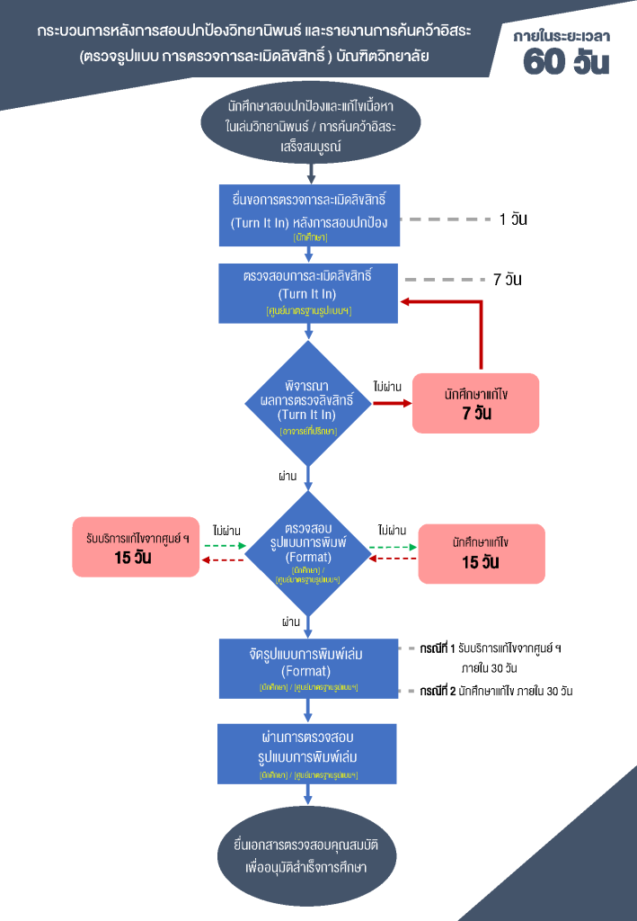 - (นักศึกษา) ยื่นขอการตรวจสอบการละเมิดลิขสิทธิ์ (Turn It In) หลังการสอบปกป้อง (1 วัน)